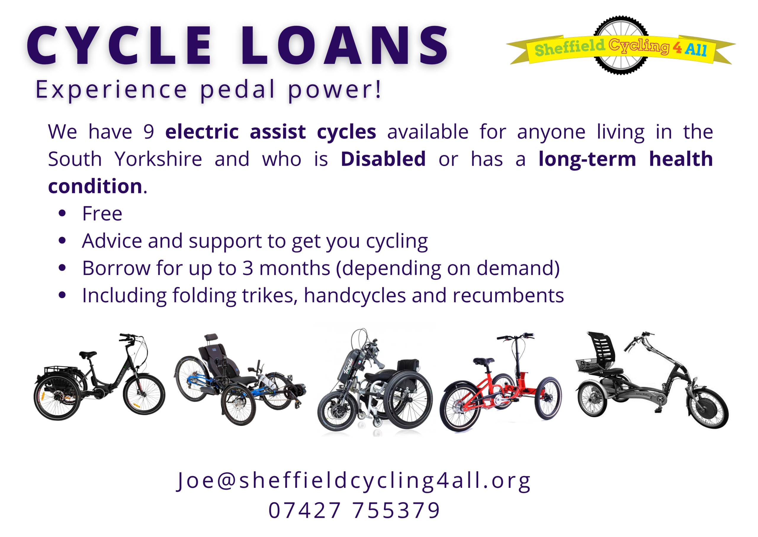 If you are interested in borrowing a cycle, please email info@sheffieldcycling4all.org or joe@sheffieldcycling4all.org contact 07427 755379